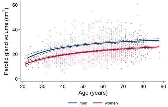 Parotid gland volume was significantly higher in male subjects with a mean of 27.82 cm3 (95 % CI 27.15 to 28.50) than in female subjects with a mean of 21.60 cm3 (95 % CI 21.16 to 22.05) (p < 0.001). There was a significant effect of age on parotid volume in both women and men (p < 0.001) with increasing gland size in older age (see Figure 5).