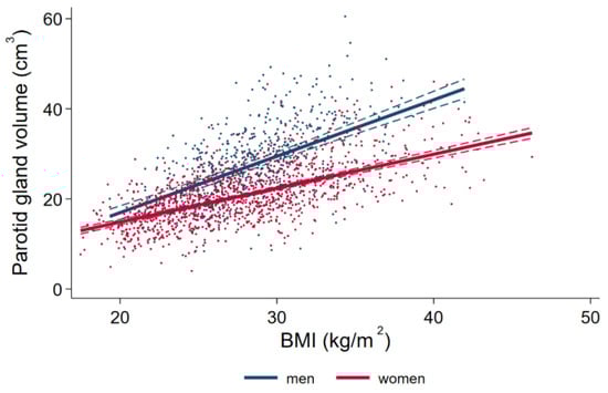 In both females and males, BMI was positively associated with parotid gland volume (p < 0.001). Association of BMI with parotid volume was stronger in males than in females as shown in Figure 6.
