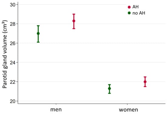 We observed a positive association between the presence of arterial hypertension and parotid gland volume in men (p = 0.027) but not in women (p = 0.056). (Figure 7, Table 2). In hypertensive males the adjusted mean parotid volume was 28.3 cm3, while in non-hypertensive males the adjusted mean volume was 27.0 cm3.