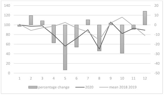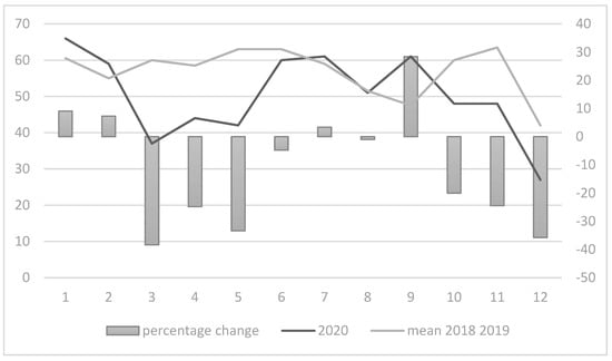 Comparison of admissions that occurred between the last ten months of 2020 (March-December) and the mean of the years 2018–2019.
