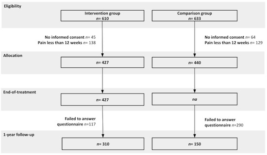 Functional long-term outcomes reported across the literature diverge, following either in-person or digital physiotherapy. In a systematic review assessing non-invasive non-pharmacological treatment, such as exercise for chronic pain, no long-term functional improvement for chronic low back pain and osteoarthritis pain was reported [98]. However, for chronic neck pain, exercise seemed to have a short- and long-term effect in improved function [98]. On the other hand, telerehabilitation studies failed to report evidence of sustained functional improvement [31,89]. In the present study, alongside pain reduction, significant long-term functional improvements were observed in the intervention group (47.4% response rate vs. 36.9% in the comparison group), as suggested by a significant OR both in completers and the entire cohort.