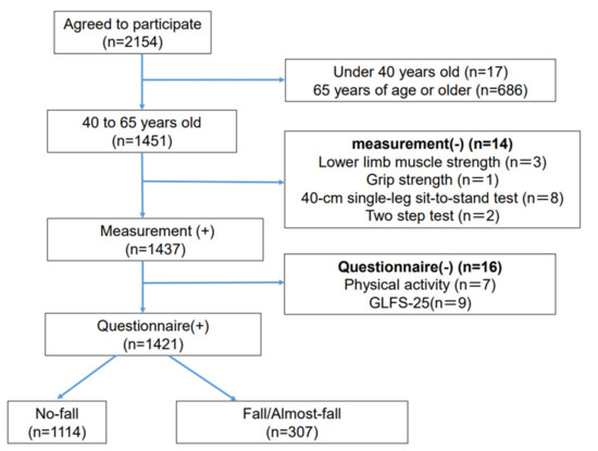 Of a total of 2154 women who participated in the Japan Multi-Institutional Collaborative Cohort Study from Kyoto, Japan, between April 2016 and December 2017 [15,16,17], 17 women under 40 years old and 686 women aged 65 years and over were excluded from participating in this study; thus, 1451 women aged 40 to 64 years remained. Following the exclusion of those with incomplete measurements (lower-limb muscle strength, n = 3; grip strength, n = 1; 40 cm single-leg sit-to-stand test, n = 8; two-step test, n = 2) and questionnaires (GLFS-25, n = 9; physical activity, n = 7), 1421 participants were finally included in the study. The participants were divided into two groups (No-fall, Fall/Almost-fall) based on their answers to the question of whether they had fallen in the last month (Figure 1).