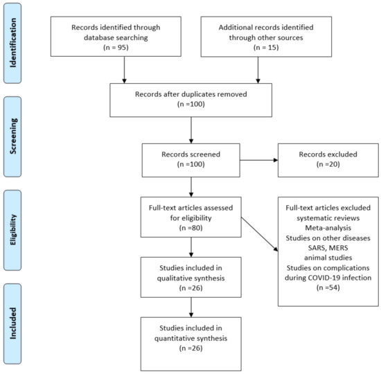 During the first step of the literature review process, 100 manuscripts were included and appraised for compliance with the inclusion criteria. After this process, we obtained a remainder of 80 articles, in which we performed an analysis of the information provided within the abstracts. Finally, we selected 26 manuscripts for this literature review (Figure 1).