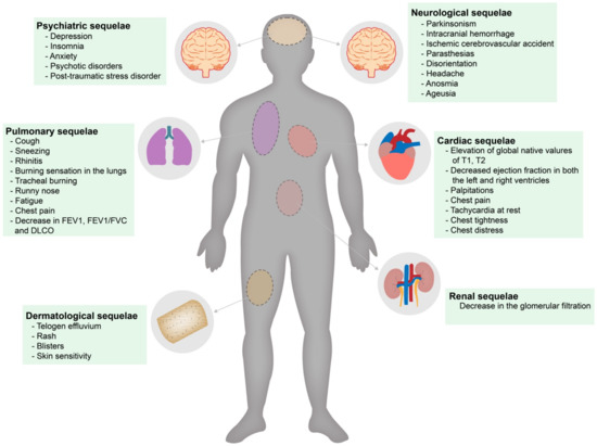 In total, 87% of people recovered and discharged from hospitals showed persistence of at least one symptom even at 60 days [18]; the prevalence of residual symptoms was about 35% in patients treated for COVID-19 on an outpatient basis, but around 87% among cohorts of hospitalized patients [19]. The most common symptoms of long COVID-19 are extreme tiredness (fatigue), shortness of breath, loss of smell, and muscle aches [20,21]. However, there are plenty of symptoms one can have after a COVID-19 infection, including: problems with memory and concentration (brain fog), chest pain or tightness, difficulty sleeping (insomnia), heart palpitations, dizziness, pins and needles, joint pain, depression and anxiety, tinnitus, earaches, feeling sick, diarrhea, stomach aches, loss of appetite, high temperature, cough, headaches, sore throat, changes to sense of smell or taste, and rashes [11,21]. It is essential to point out that even though the severity of the disease is a significant risk factor, several patients with milder and asymptomatic processes can develop long-lasting and disabling sequelae, such as brain fog, paresthesia, muscle weakness, and others [22]. Despite advancing treatments for COVID-19, the long-term sequelae of this disease are expected to endure in survivors [23].