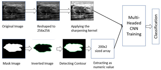 We have analyzed the ultrasound images of breast cancer containing three classes (Benign, Malignant, and Normal). Multiple medical researchers used their own collected dataset [24,31]. Another popular dataset is Wisconsin Diagnostic which consists of 32 numeric features [40]. However, we wanted to use an image dataset, so we have used a publicly available ultrasound dataset which was released in 2018, the Breast ultrasound images dataset (BUSI) [41], collected from women between 25 and 75 years old, and the dataset details are shown in Table 1. A sample of the dataset is shown in Figure 1. This dataset has two types of images: raw images scanned by the LOGIQ E9 ultrasound system and masked ground truth images. We have used the masked images as a separate image base to combine the image and numeric data as multi-head CNN’s input layers. The total number of images is 830 and 75% of these images are used for training and 25% for testing.