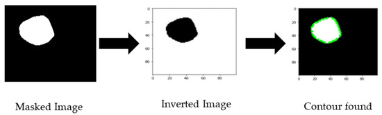 The initial idea was to obtain the numeric polygon value for the covered mask area of the cancer portion for one training branch of CNN. To achieve this, we have processed masked images to obtain the border of the cancer part by exporting the contour area. First, we inverted the color and resized the image to 100 × 100 pixels, then giving the (255,255) threshold, the coordinates of the contour area were exported (shown in Figure 3). The exported contour values were not uniform, so we needed to add padding values to make all the extracted values the same length. We obtained the maximum length of contour points and reshaped them as numerical coordinate data into a 2D array of shapes (200, 2).