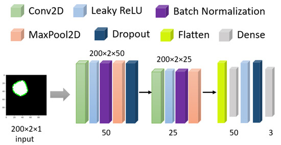 From Section 2.2.1, we have a 2D array of processed masked coordinates of shapes. Now, that dataset is evaluated through a Conv2D model (shown in Figure 5) with 100 epochs and a dynamic learning rate reduction method (monitoring validation accuracy with factor 0.5 and minimum learning rate of 0.00001) to avoid overfitting. For training, 75% of the data and for testing, 25% data has been used. The initial input size is 200 × 2 as the data format with 50 neurons and 0.1 as alpha in the LeakyRelu, followed by BatchNormalization, 2 × 2 MaxPooling with 1 Stride and 30% Dropout. In the second cell, the neuron decreased to 25, and alpha increased to 0.2 for LeakyRelu. Finally, with 100 Dense units in the flattened layer, the result has been extracted with a softmax function. This model has 512,128 trainable parameters.