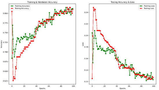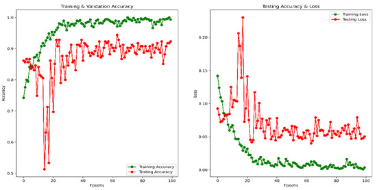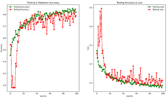 Finally, we have combined the original image and masked image inputs with a two-headed CNN model to train parallel models, giving one output series of three classes. The initial learning was the default TensorFlow value, but to avoid the overfitting problem, a callback method was used for a dynamic learning rate reduction. The batch size was 20, and the training-testing set was 75–25% with 100 epochs. The final CNN model is shown in Figure 11 and all the related parameters and layers are described in Table 4. We have used the Google Colab free version to train our model. The free version gives us 12 GB RAM and 15 GB GPU. Training of 100 epochs with the multi-headed model utilized 3.63 GB RAM and 4.99 GB GPU and each epoch took 6 s (220 ms/step) for 29 steps. After training, we saved the model in h5 format for use with the web interface, and the model weight size is only 4.64 MB.