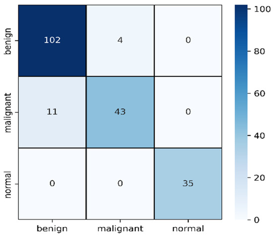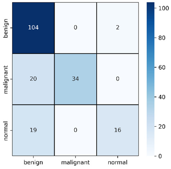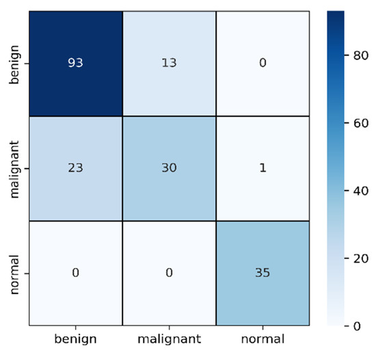 In Table 2, the F1 score of malignant is comparatively lower than the other two types though the sample number is medium. Among 54 samples, 23 have been detected as benign and the other 1 as normal. As the differences between malignant and benign from images are very difficult to detect where shapes are slightly differentiable, it is understandable why these two became confused. On the other hand, the 93 benign cases are successfully detected and confused only 13 cases with malignant ones.