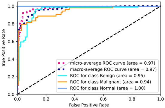From Table 5, we can clearly see the improvement in mask and raw image processing results. This time, the F1 score improved in all three categories, especially for the malignant category. This one is likely to be identified as benign on mask processing, but in this combined scenario, the detection rate was improved and only 11 cases were misclassified causing an F1 score of 85%. The benign improved from 84% average F1 score to 93%, misclassifying four cases. On this combined architecture, the normal cases are highly improved in detection with 0 misclassifications. From the ROC curves, the ROC values on training dataset for benign, malignant and normal are found to be 95%,94%, and 100%.