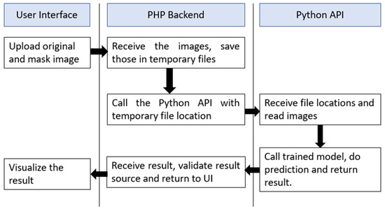 To make this system available for non-technical persons, we have developed a web interface in localhost with PHP—v7.4 backend. The system takes two images as input, one is the original ultrasound raw image and another one is the mask of that image. These two images are processed and sent to a python—v3.8 code by AJAX for prediction. Python receives these two images, performs the processing and returns the processed pre-input image format and the predicted class in JSON format. Upon receiving the JSON output, AJAX shows the result images and classification results in real-time. The software flowchart is shown in Figure 15. After further development and proper hosting, this site will be published in a live website interface.