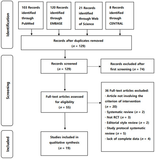 We identified 252 publications (Figure 1) through electronic database searches. After eliminating duplicates, 129 articles were selected, 74 of which were excluded after screening the title and abstract. We reviewed 55 articles for eligibility by assessing the full text. The reasons for study exclusion during the final review were as follows: editorial style review (n = 2), systematic review (n = 2), study protocol systematic review (n = 5), lack of complete data (n = 4), articles not involving criterion of intervention (n = 20), and articles that were not RCTs (n = 3). We included the remaining 19 articles to evaluate the reporting standard guidelines of NMAs for physical therapy (Figure 1).