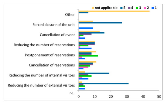 Additionally, 16 entrepreneurs mentioned the “cancellation of events” as a type of negative impact, mainly regarding the visitor attractions and accommodation units. Level “1” is mentioned by fewer entrepreneurs, especially for the types of impacts related to “decreasing the number of reservations” (8 cases) and to “cancelling bookings” (9 cases).