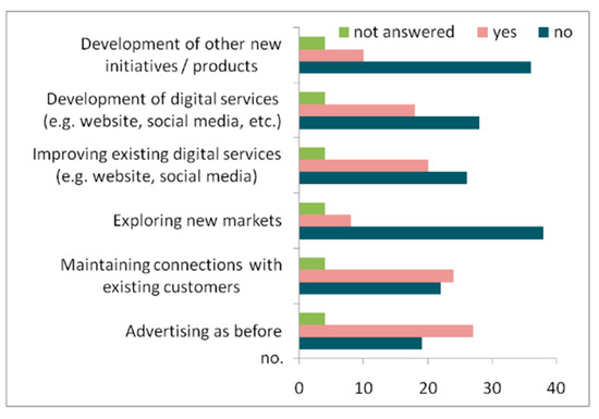 New measures aiming to offset the negative impact of the COVID-19 pandemic have been taken. The respondents have mentioned mainly three measures: 27 respondents (58.7%) mentioned “advertising as before”, 24 respondents specified “maintaining connections with existing customers”, and 20 respondents leaned more on “improving existing digital services (e.g., website, social media)” (