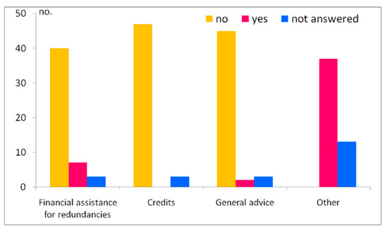 Support under crisis situations is extremely important, but in terms of the assistance received from the government to offset any impact of the pandemic, the great majority of entrepreneurs mentioned that they did not receive either financial assistance for redundancies or credits lines or even general advice (40 cases, 47 and, 45 entrepreneurs, respectively). The category “other” (meaning general advice from the media and technical unemployment at a rate of −75% of a person’s wages) was mentioned by 37 entrepreneurs (