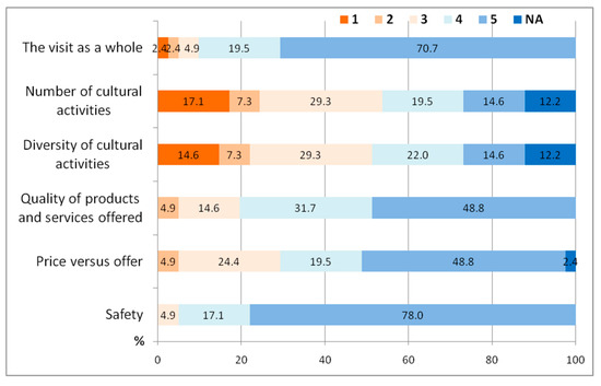 A response found very often is “not applicable” which, together with the “1” score (I visit much less) was chosen by the great majority of surveyed residents. There are cases where the number of residents who chose the answer “not applicable” is predominant, reaching 78% for cultural attractions/sites/events, such as “art galleries”, “townscapes” and “film/theatre”. “Music events (concerts/festivals)” and “dance events” were equally considered as “not applicable” and/or assigned level “1” by most residents (almost 42% for each category) is the response to the COVID-19 pandemic restrictions which have also limited their movement. Moreover, visiting “townscapes”, “film/theatre” or “art galleries” are considered an option by residents, given the particularity of the study area or the proximity to areas that might have such tourist offers.