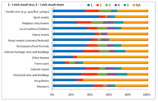 Figure 16) and some of the residents did not travel at all to visit different tourist attractions (tourist, male, 74 years old: “I haven’t travelled at all during the pandemic”). Thus, in the case of all cultural attractions, events and sites, residents provided their viewpoint on a scale from “1” (I visit much less) to “5” (I visit much more). An important number of residents ranging from 6 (the minimum value, in the case of “townscapes”) to 23 (the maxim value, in the case of “sportive events”) pointed to level “1” (mainly women over 35 years old, working in services and or as sales workers, with a less than 10,000 EUR income/household/year).