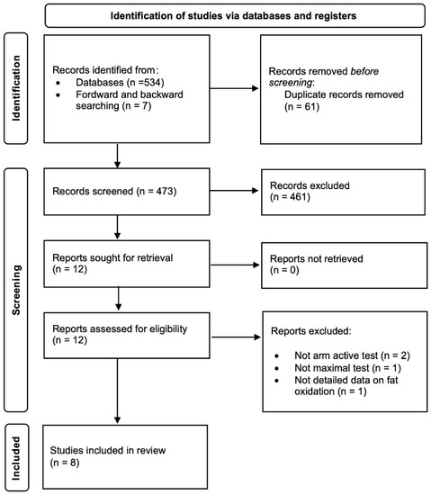 A PICOS (participants, intervention, comparators, study outcomes, and study design) approach was used to rate studies for eligibility [23]. Therefore, the search included studies carried out in people with SCI who were older than 18 years and performed an arm exercise protocol at different intensities to determine PFO and Fatmax based on gas analysis through indirect calorimetry. Observational and intervention studies published in English and Spanish were included. The exclusion criteria were studies on wheelchair users that did not specify that at least 75% of the included participants had an SCI. Two independent reviewers screened the titles and abstracts retrieved by the search and excluded the studies that were not eligible. Twelve studies were retrieved in full text and, after reading them, eight were selected to be included in the review (Figure 1).