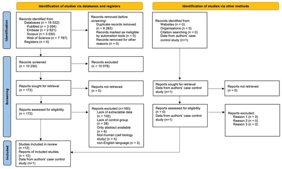 Figure 1 shows the results of the search identifying a total of 16,532 records, of which, 6282 were duplicates. The titles and abstracts of the following 10,250 records were screened, and 172 full texts were retrieved, of which, 12 articles were included in the study.