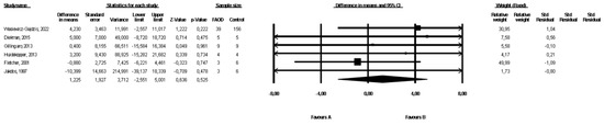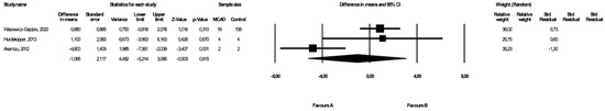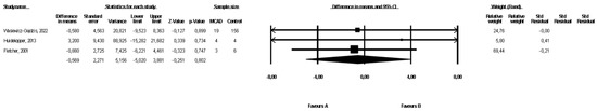 Six studies presented data on weight for the FAOD and the control groups ([16,18,19,21,22], Wasiewicz-Gajdzis et al., 2022). No study reported statistically significant differences between the groups. The meta-analysis showed no difference in weight between the FAOD and the control groups (fixed-effects model, SE: 1.93, 95% CI: −2.55, 5.00, p = 0.53, Figure 2). The risk of heterogeneity was assessed as small (Q value = 0.232, p = 0.80, I2 = 0). The funnel plot of standard error by a difference in means of weight is presented in the Supplementary Materials (Figure S1). The Begg and Mazumdar’s rank correlation test (p = 0.70) and the Egger’s regression test (p = 0.96) were performed.
