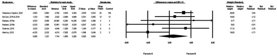 Six studies included data on the BMI of patients with types of FAOD other than MCAD ([14,17,18,20,25,26], Wasiewicz-Gajdzis et al., 2022), with no study reporting a statistically significant difference in BMI. The meta-analysis showed no difference in BMI between patients and the control group (random-effects model, SE: 1.32, 95% CI: −1.90, 3.26, p = 0.60, Figure 7), and the risk of heterogeneity was substantial (Q value = 11.67, p = 0.04, I2 = 57.17). A funnel plot of the standard error by a difference in means of weight is presented in the Supplementary Materials (Figure S6). We performed the Begg and Mazumdar’s rank correlation test (p = 0.71) and the Egger’s regression test (p = 0.42).