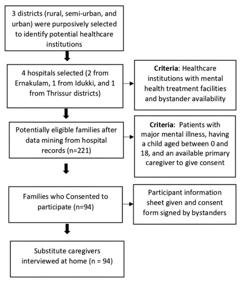 The mixed-method study was conducted in four purposively selected psychiatric inpatient care facilities situated in three districts, representing the socioeconomic and cultural diversity of the people of Kerala: Ernakulum (urban), Idukki (rural), and Thrissur (semi-urban). Information was obtained from the substitute caregivers of children with a parent with mental illness. The face-to-face interviews were conducted from December 2019 to February 2020 at the residences of eligible participants. To maintain confidentiality, each respondent received a unique ID.