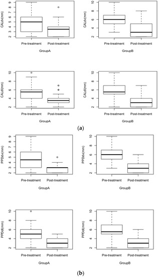 Figure 2. Periodontal values at baseline and 6 months after third molar extraction in Group A (envelope flap) and Group B (triangular flap). (a) CAL in groups A and B, before and after extraction at the distovestibular and distolingual points. Box plot: median, upper quartile, lower quartile, upper extreme, lower extreme. CALdv = CAL measurement at the disto-vestibular aspect of teeth; CALdl = CAL measurement at the disto-lingual aspect of teeth. (b) PPD in groups A and B, before and after extraction at the distovestibular and distolingual points. Box plots: median, upper quartile, lower quartile, upper extreme, lower extreme. PPDdv = PPD measurement at the disto-vestibular aspect of teeth; PPDdl = PPD measurement at the disto-lingual aspect of teeth.