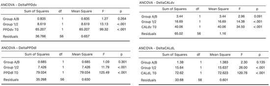 Figure 3. Between-group comparisons with ANCOVA: treatment type (A/B) as the independent variable; difference between preoperative and postoperative measurements as the dependent variable; covariables were age (1/2) and preoperative measurements. Legend: CALdv = CAL measurement at the disto-vestibular aspect of teeth; CALdl = CAL measurement at the disto-lingual aspect of teeth. PPDdv = PPD measurement at the disto-vestibular aspect of teeth; PPDdl = PPD measurement at the disto-lingual aspect of teeth; T0: preoperative measurements.
