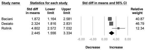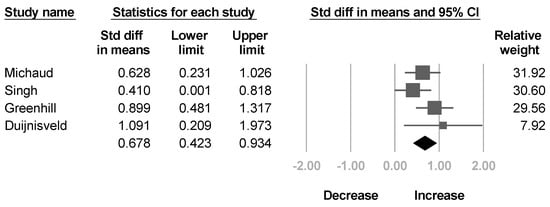 Four studies [,,,] reported the passive ROM of shoulder external rotation before and after BoNT injection. The summarized effect size showed a significant increase in passive ROM of shoulder external rotation without significant heterogeneity (SMD, 0.678; 95% CI, 0.423 to 0.934, I2 = 17.4%; Figure 3).