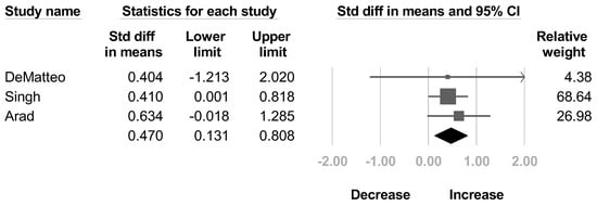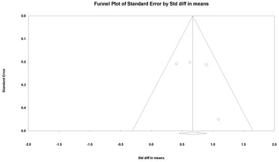 The meta-regression, sensitivity analysis, and publication bias were only conducted for passive ROM of shoulder external rotation due to insufficient data of the other outcomes. The meta-regression analysis did not reveal a significant relationship between age and the improvement of passive ROM of shoulder external rotation (p = 0.88). In the sensitivity analysis, the lowest SMD was 0.139 (95% CI, 0.304 to 0.849) when the study by Greenhill et al. [] was excluded, and the highest was 0.203 (95% CI, 0.423 to 0.934) when the study by Michaud et al. [] was excluded. No publication bias was detected by the funnel plot (Figure 11) and Egger’s test (p = 0.47).