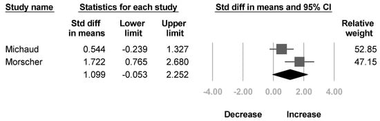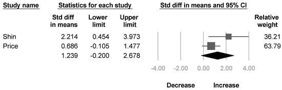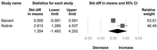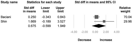 Two papers [,] reported the modified Gilbert scale for shoulder abduction. The pooled estimate did not reach statistical significance, and the heterogeneity between studies were also significant (SMD, 1.239; 95% CI, −0.2 to 2.678, I2 = 58.5%; Figure 5).