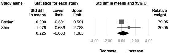 Two studies [,] reported the Toronto score for active elbow flexion. No significant improvement in active elbow flexion was found after BoNT, and the heterogeneity reached statistical significance (SMD, 1.099; 95% CI, −0.053 to 2.252, I2 = 71.3%; Figure 7).