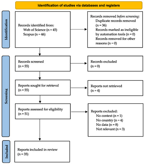 The PRISMA flow diagram in Figure 1 shows the flow of information through the different stages of a systematic review. It shows the number of records identified, included, and excluded and the reason for the exclusion. From the WoS, we have collected 45 records, and from Scopus, 46 records. After removing 36 duplicates, 55 records were screened based on title and abstract.