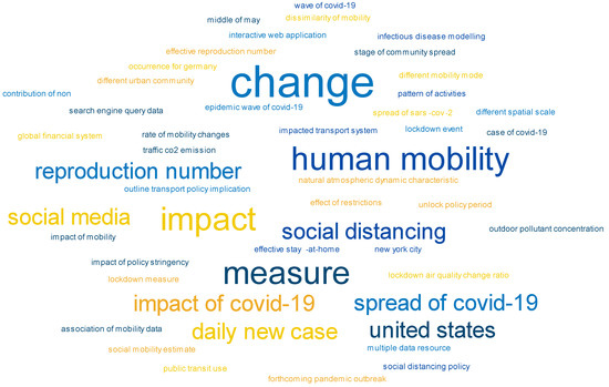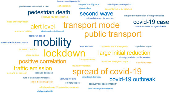 Table 4 presents the outcomes of the studies. The lockdown has reduced the spread of COVID-19 by decreasing the number of routing requests across all three modes of transportation available in Apple Mobility Trends Data. Additionally, the lockdown has caused a decrease in outdoor air pollution levels. Traffic emissions have decreased significantly since the start of the coronavirus pandemic. All transport modes have seen a decrease in emissions, and public transport has seen the most significant reduction. There is a positive correlation between mobility and the spread of COVID-19, which means that the more people move around, the more the virus will spread. Containment delays and serial intervals were shortened over time, so the virus spread faster than expected. Air pollution concentrations decreased during the mobility restrictions period compared to the same period in 2019. Separately recorded NPIs such as school closure and closure of businesses and public services were closely correlated, both in timing and occurrence. Figure 3 presents a word cloud to visualize the most important text data in Table 4.