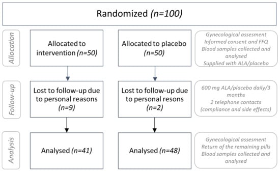 A total of 100 patients were randomized into the placebo (n = 50) or the treatment group (n = 50). Eleven patients did not finish the trial due to personal reasons (two patients from the placebo group and nine patients from the treatment group). (Figure 1). No side effects were reported following the intake of ALA supplements or placebo throughout the study. Additional description of the study design and more detailed flow diagram of the progress through the phases of a trial (CONSORT checklist and CONSORT flow diagram) are presented as Table S1 and Figure S1, respectively (Supplementary Materials). Raw experimental data obtained during the study are presented in Table S2 (Supplementary Materials).