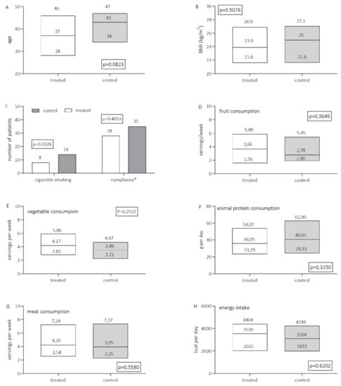 Characteristics of study groups at baseline regarding age (A), BMI (B), cigarette smoking and compliance (C) and dietary habits (D–H). Results are expressed as medians (min–max range) Results were tested by Mann–Whitney’s test (A, B, D–H) and by Fisher’s exact test (C) and respective p values are indicated in each figure. Data on dietary habits are obtained by validated semiquantitative FFQs. * Expressed as the average number of returned capsules at the end of the study.