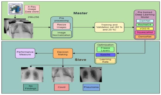 The new coronavirus disease 2019 (COVID-19) has caused a worldwide pandemic. There is an increased demand for COVID-19 testing and diagnosis due to the high number of cases. Cases of this virus are increasing daily, putting a significant strain on our social, emotional, physical, and mental health. Moreover, early detection of COVID-19 cases is a crucial and beneficial step in the virus’ prevention. One of the primary reasons for the rapid spread of COVID-19 cases is the traditional time-consuming testing process. A chest X-ray or other imaging tool could be used instead to expedite the testing process and stop the spread of the virus. As a result, this study aims to create a computer-assisted diagnosis (CAD) system to classify samples of COVID-19 from a chest X-ray dataset that includes pneumonia, COVID-19, and healthy cases. The study focuses on analyzing X-ray images for early COVID-19 detection. With an accuracy of 83.33%, the proposed master–slave approach with DenseNet201 outperforms other models. The research can be expanded in the future to improve model accuracy by using data augmentation techniques to increase the dataset size. Furthermore, GPUs can be used to train models quickly.