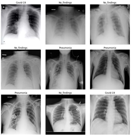 In our research, the dataset utilized for the study consists of X-ray images prepared by integrating images from two different data sources that were used to detect COVID-19 infection. The first dataset comprises COVID-19 X-ray images developed by Cohen et al. [28], including images retrieved from several open-access resources. Also, this source regularly updates images shared by several researchers from different regions. This dataset currently contains 127 X-ray images diagnosed with COVID-19. This dataset consists of 43 female and 82 male patients diagnosed as COVID-19 positive. The second dataset incorporates chest X-rays by Wang et al. [29] that contains normal and pneumonia images. These data sources were integrated and utilized by Ozturk et al. [30,31]. They utilized 500 images of healthy lungs and 500 with pneumonia on frontal chest X-ray images. The images were selected randomly. This was done to prevent the challenge of unbalanced data. In our approach, 100 images from each group include COVID-19, no findings, and pneumonia. A few images of the dataset are shown in Figure 2.