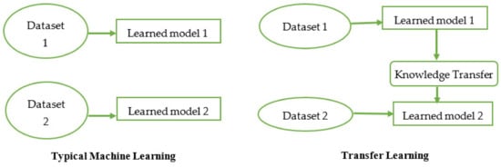 Transfer learning is based on real-world scenarios. For example, if someone knows how to ride a bike, they can ride a car using the same knowledge. Humans transfer knowledge gained from one domain to another to learn things fast and more efficiently. Similarly, transfer learning uses the previously learned models on some datasets to map the gained knowledge using new data. However, there is a difference between typical ML and transfer learning. In typical ML, algorithms are used to train the model from the start without retaining the knowledge gained from previous training. In contrast, transfer learning retains the previously gained knowledge to train with the new domain or data, as shown in Figure 3.