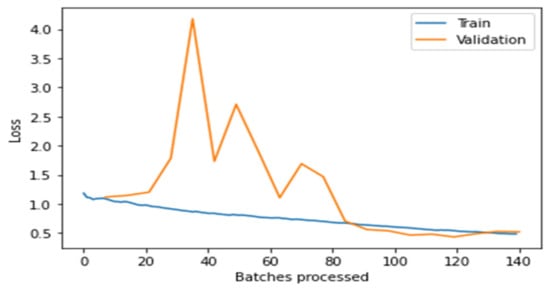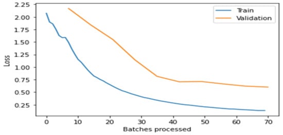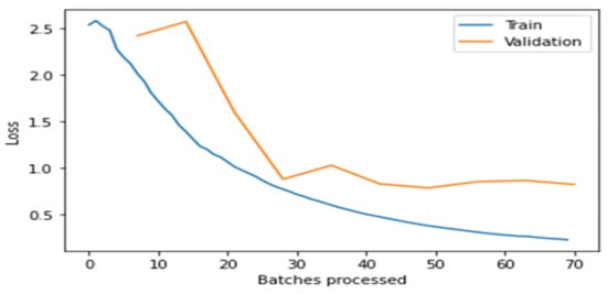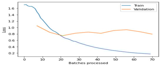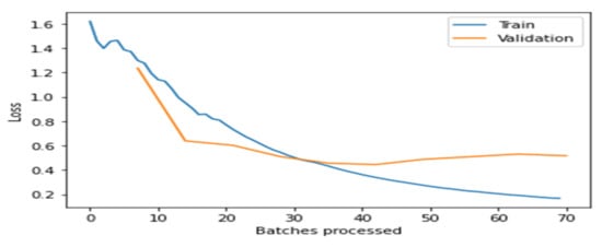 From the above Figure 4, Figure 5, Figure 6, Figure 7 and Figure 8, it is clear that, initially, the training and validation losses are high, then, as the epochs increase, they eventually decrease. Mostly, the training and validation losses stabilize for all the models trained after 65 batches. After 10 epochs, i.e., 70 batches, there is a minor change in training and validation losses for every model. It also depicts that the losses of the DenseNet201 model are less compared to the other models, proving it to be better than the other four models.