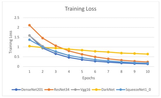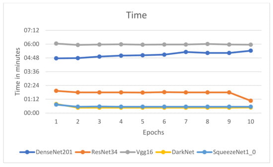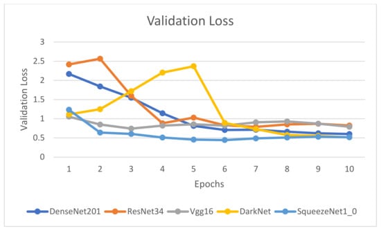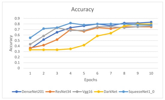 Figure 9, Figure 10, Figure 11 and Figure 12 depict that the accuracy of all the models has increased considerably after the eighth epoch and stabilizes at the ninth epoch. Figure 9, Figure 10 and Figure 11 also showcase that DenseNet201 outperforms other models achieving an accuracy of 83%, while DenseNet201 and SqueezeNet1_0 have minimum losses in contrast to the other four models. Moreover, the fastest models among the five are DarkNet and SqueezeNet, as depicted in Figure 11.