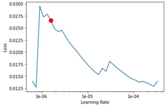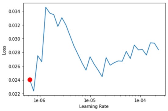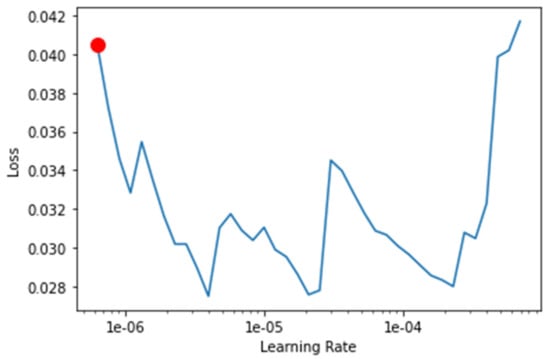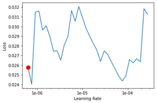 The transfer-learning models are fine-tuned to find the best learning rate. Figure 13, Figure 14, Figure 15 and Figure 16 depict the learning rate concerning the loss for ResNet34, VGG16, SqueezeNet1_0, and DenseNet201, respectively. The red dot indicates the best learning rate for the respective model that can give the highest accuracy. Thus, for all the methods, the learning rate is selected to be nearer to the red dot, as shown in Figure 13, Figure 14, Figure 15 and Figure 16.