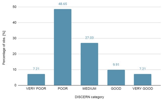 In this study, the total number of points obtained on the DISCERN scale was used for the final score of the reliability of articles. Points 16–26, 27–38, 39–50, 51–62, and 63–80 points indicated “very poor”, “poor”, “medium”, “good”, and “very good” levels of reliability, respectively [].