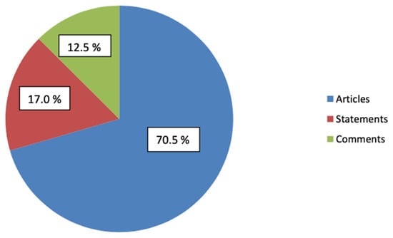 All the texts were divided into three subgroups: comments (12.5%), statements (17%), and articles (70.5%) (Figure 3). The average number of points scored with DISCERN was 38.36, 39.15, and 40.05 points for statements, comments, and articles, respectively. The differences were not statistically significant. However, no correlation of the score obtained with DISCERN with the statistics on social media was found. In particular, statements in social media had greater indicators of reach, views, and shares than articles on other publishing scientific websites. Basic social media statistics of reaches and interactions are included in Table 3. Moreover, out of the three groups of data, statements from social media had the highest response rate in question 16, rated both the lowest (31.58%; 8.86% for articles and 15.38% for comments) and the highest (10.53%; 3.80% for articles and 7.69% for comments).