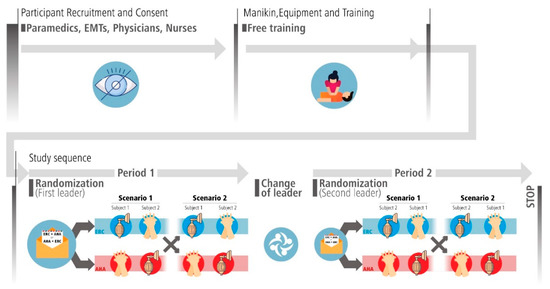 Study sequence. Teams of two participants will first train on a manikin identical to the one used to collect data. After entering the study room, the first leader will pick an opaque, sealed envelope, and carry out two resuscitation sequences according to the allocation. Team members will then switch roles. The new leader will then pick another envelope and perform the two last resuscitation sequences accordingly.