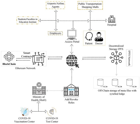 The suggested blockchain-based solution’s system diagram is shown in Figure 1. It shows on-chain participants, a variety of smart contracts, clients of blockchain, and concerned stakeholders. In our suggested approach, we have employed four different forms of smart contracts: Smart contracts include the MoH, the MoFA, the COVID-19 Testing Center, and the Patient. The smart contracts, as well as other system sub-components, are described in depth below.