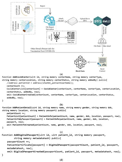(a) Data storing process. (b) Smart contract function for adding centers. (c) Smart contract function for adding detail of patient. (d) smart contract function for creating digital passport.