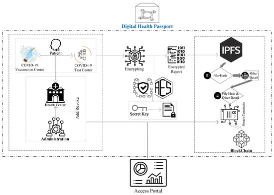 IPFS is a decentralized storage system for off-chain certificates. The cost of storing papers relevant to COVID-19 testing, identification, and travel on-chain would be prohibitive. As a result, data must be stored in a decentralized and secure manner. IPFS storage is public and widely distributed and as a result, IPFS data should be encrypted, and decrypted data must only be accessible to authorized parties. As a result, in the system design model of the proposed platform, a data handler encrypts the certificate as a DHP with a secret key and uploads it to the IPFS server. Furthermore, the proposed model gives access to several users to view the data while ensuring secrecy []. Hospitals, scanning/testing centers, airline agents, airport authorities, and employers are among the organizations that fall within this category. As a result, a method should be implemented that permits material to be shared with the data owner’s consent. The technology should also allow clear content to be accessed by just the authorized recipient.
