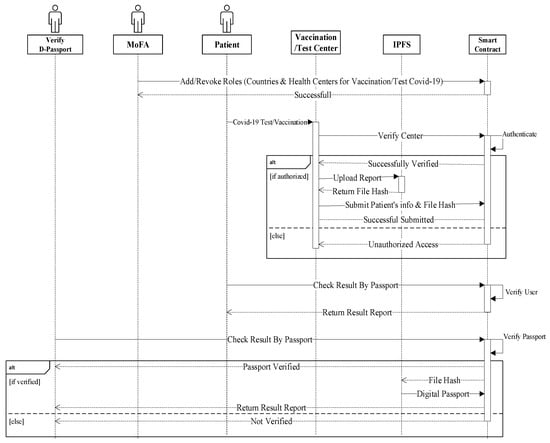 Figure 8 depicts the sequence diagram for all network elements and their interactions. Figure 8 depicts the system’s execution flow. Multiple entities are present (MoFA, MoH, Health Centers, IPFS, Smart Contract). The data from the blockchain ledger was accessed via a web interface by health centers and patient entities. The health center entity was used to submit COVID-19 data (test takers and vaccine takers) to IPFS and get a file hash that was mapped with other needed information parameters and saved in the blockchain.