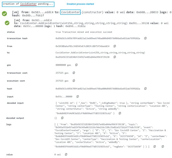 The approved entity that can use the AddCovidCenter function is specified in the MoH smart contract. The new decision’s effective date, as well as the Ethereum address of the MoH-affiliated testing and immunization facility, are included. This is made known to all interested listeners via an event. The task was completed successfully, as shown in Figure 9, and the event contains the time in uint256.